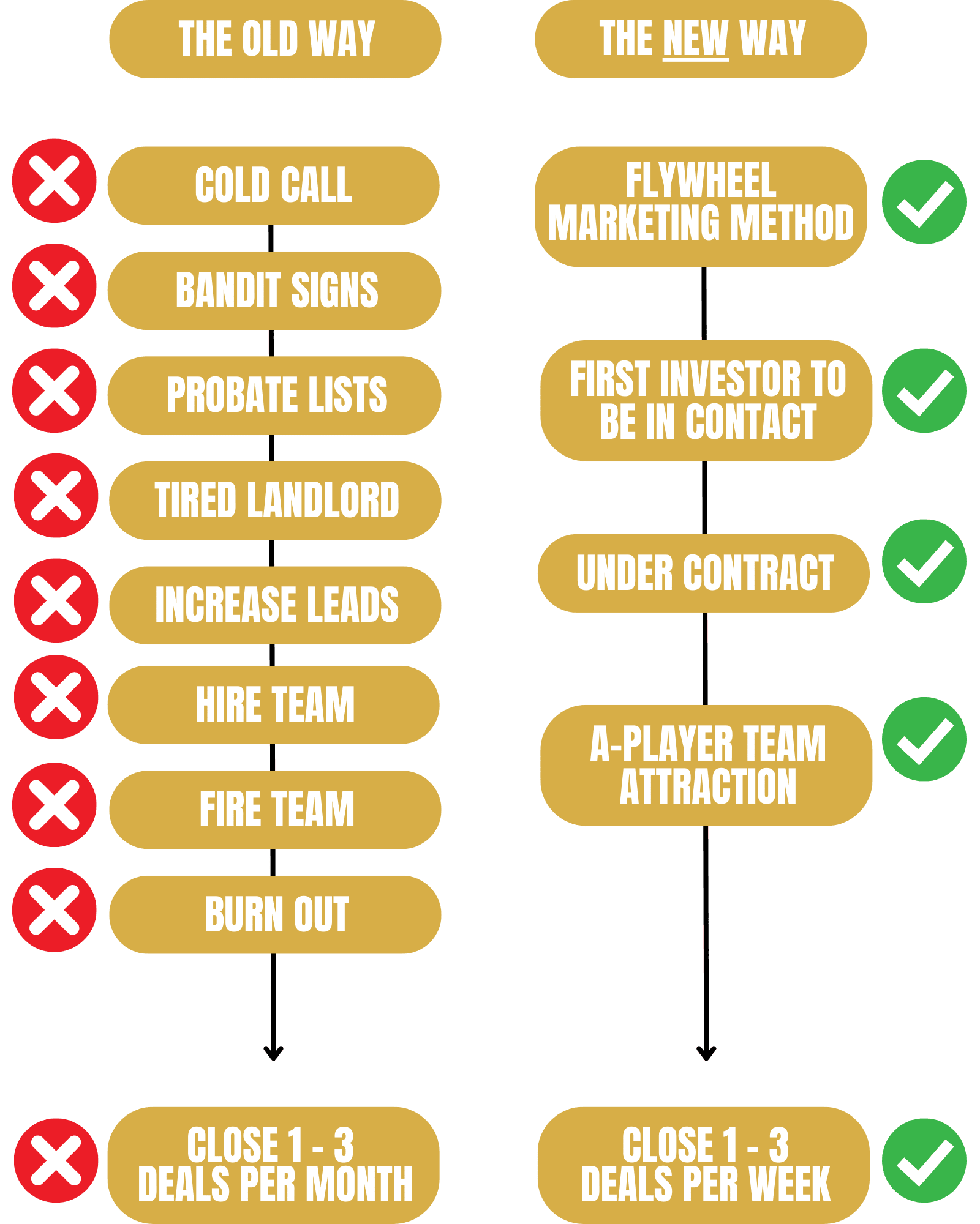 We achieve this by following our 3-prong system that attracts rockstar team members, and building out our Fly Wheel Marketing Method to bring in highly motivated seller leads on autopilot... (instead of cold calling, driving for dollars, bandit signs, or all the other 'time eating methods')